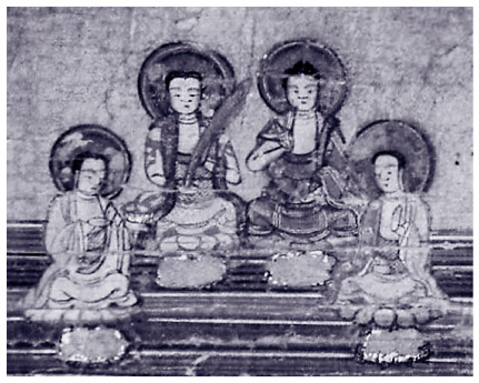 Четыре главных пророка манихейства на манихейской диаграмме вселенной. Слева направо: Мани, Заратустра, Будда и Иисус. XIII–XIV вв.