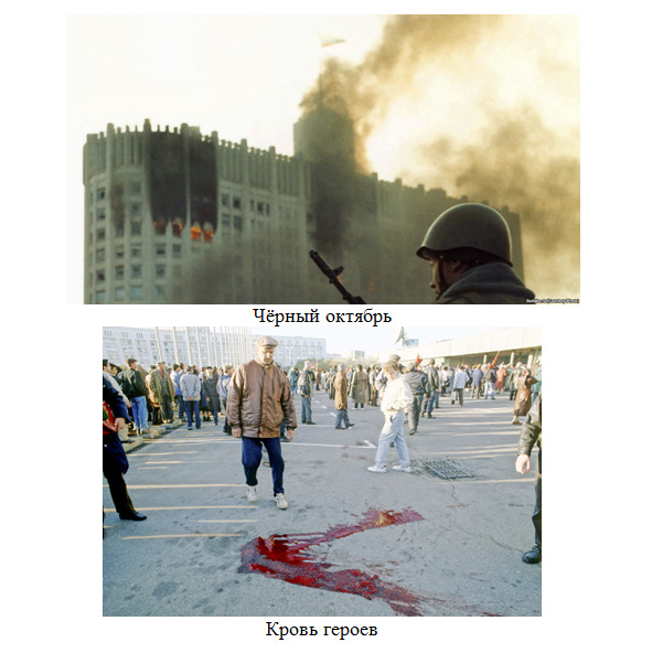 Чёрный октябрь192192События сентября – октября 1993 года в Москве (также известные как «Расстрел Белого дома», «Расстрел Дома Советов», «Чёрный октябрь», «Октябрьское восстание 1993-го», «Указ 1400», «Октябрьский путч», «Ельцинский переворот 1993 года») – внутриполитический конфликт в Российской Федерации 21 сентября – 4 октября 1993 года. Произошёл вследствие конституционного кризиса, развивавшегося с декабря 1992 года. Результатом противостояния стало насильственное прекращение действия в России существовавшей с 1917 года советской модели власти, сопровождавшееся вооружёнными столкновениями на улицах Москвы и последующими действиями войск, в ходе которых погибло не менее 158 человек и 423 были ранены или получили иные телесные повреждения (из них 3 и 4 октября – 124 убитых, 348 раненых).