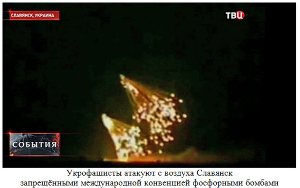 Фо́сфорные авиабомбы – тип зажигательных боеприпасов, сбрасываемых с самолётов-бомбардировщиков снаряжённых белым фосфором или зажигательными веществами на основе белого фосфора в смеси с другими веществами. Белый фосфор и зажигательные вещества на основе белого фосфора относятся к группе самовоспламеняющихся зажигательных веществ, горящих с использованием кислорода воздуха. Дополнительные протоколы 1977 года к Женевской конвенции о защите жертв войны 1949 года, запрещающие применение боеприпасов с белым фосфором, если гражданские лица попадают вследствие этого в опасность. Однако Вооружённые Силы Украины грубо нарушали конвенцию, пока ПВО ДНР и ЛНР не дали им такой отпор, что Украина на какое-то время почти лишилась военной авиации.