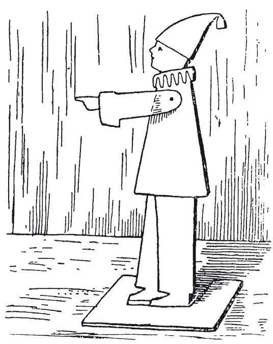 Вырежьте из картона фигуру человека и приколите кнопкой к ее плечу подвижную, вырезанную из тонкой папиросной бумаги руку. Расширьте слегка прокол, чтобы рука могла свободно вращаться. Привесьте человека к тонкой нитке и поднесите его к наэлектризованному телу или заряженному кондуктору. Он вытянет руку, указывая ею на присутствие электрического заряда (рис. 4).