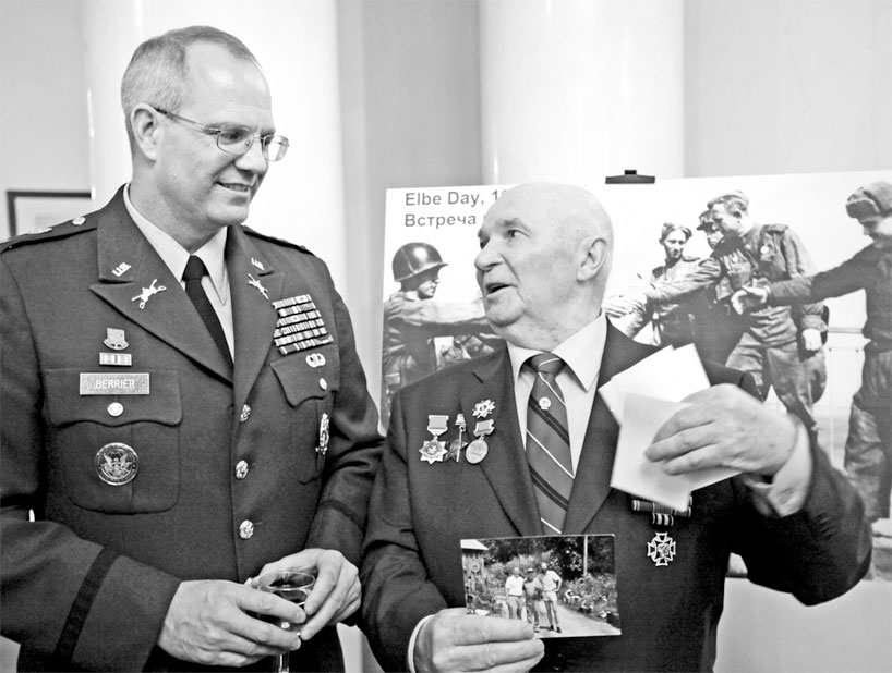 Участник встречи на Эльбе, российский ветеран Великой Отечественной войны Владимир Куц (справа) на торжественном приеме в честь 65-й годовщины встречи советских и американских войск на реке Эльбе в апреле 1945 года. Дата события: 28.04.2010