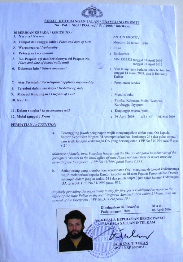 Во-вторых, кроме регистрации, вам ещё нужен пропуск на передвижение – Сурат Джалан – большой и важный пропуск формата А4. Surat Jalan – Дорожное Письмо. Чем отличается от регистрации? Регистрировать вас должны каждый день повсюду (фактически это мало где соблюдается), а Сурат Джалан можно иметь один на все районы Папуа. Только в крупных четырёх городах можно бродить без Сурат Джалана (Джайпура, Соронг, Маноквари и Набире), в остальные города (Вамена, Мерауке и т.д.) нужно приезжать уже с документом.