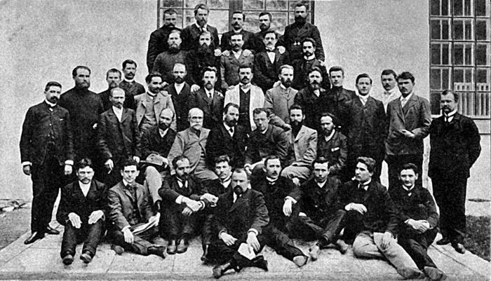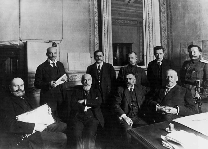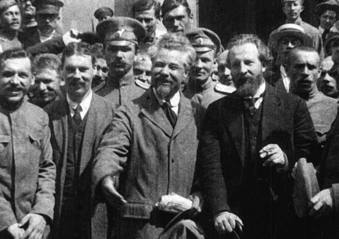 Министры Временного правительства В.М. Чернов (министр земледелия) и Н.Д. Авксентьев (министр внутренних дел) в группе общественных деятелей во время созыва Всероссийского крестьянского совета