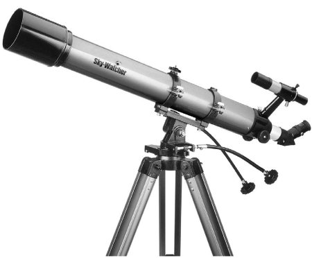 Рис. 2.10. Недорогой фабричный рефрактор на простой треноге, снабженный маленьким телескопом-искателем и окулярной призмой, – подходящий инструмент для визуальных наблюдений. Его плавное вращение вокруг вертикальной и горизонтальной осей осуществляется с помощью двух гибких рукояток. Но фотографировать небесные объекты с таким телескопом практически невозможно.