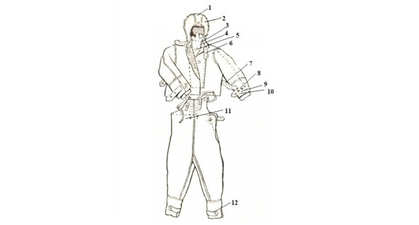 Защитный костюм из ткани МВКШ.1 – хлястик капюшона, 2-капюшон, 3-горловой клапан, 4-нагрудный клапан, 5-шпенек, 6-горловой хлястик, 7-пояс, 8 – хлястик рукава, 9-рукав, 10-подрукавник, 11-подтяжки, 12-хлястик штанины