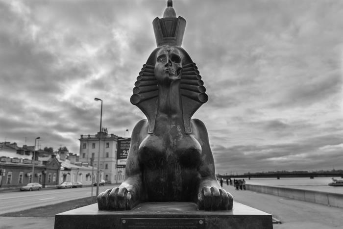 Один из сфинксов Михаила Шемякина на Воскресенской набережной Санкт-Петербурга