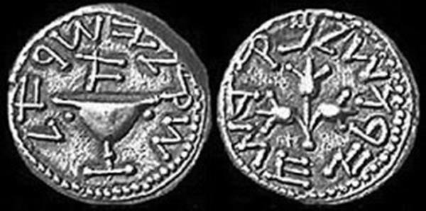 Древнееврейская монета с гранатовыми яблоками на реверсе
