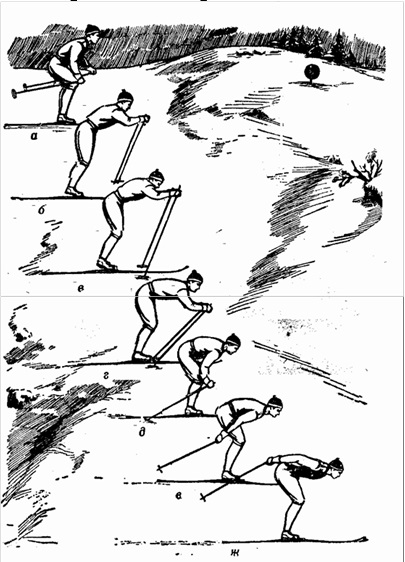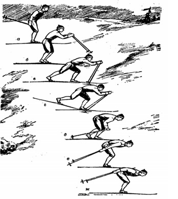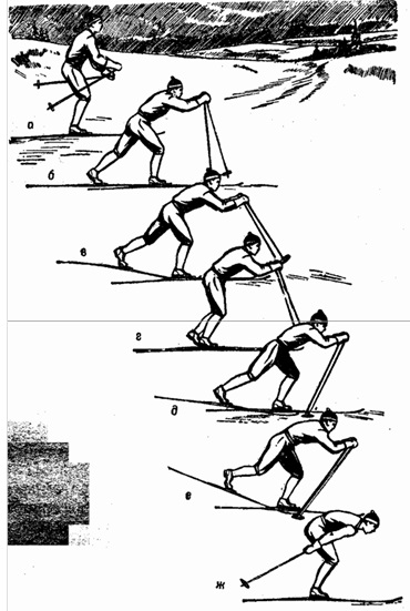 Продолжая скольжение на левой ноге, лыжник ставит правую палку на снег, наклонив ее немного вперед, и начинает толчок рукой (рис. 4, б). К концу скольжения с опорой на палку опорная нога (левая) немного выпрямляется, а маховая нога (правая) свободно, расслабленно опускается (под действием тяжести ноги) вперед-вниз (рис. 4, в). Когда обе ноги поравняются, свободная нога и рука посылаются энергичным махом вперед. Лыжа останавливается, и пятка стопы опорной ноги начинает подниматься от лыжи (рис. 4, г), а опорная нога сгибается. Происходит подседание в коленном суставе, за которым следует выпрямление (отталкивание) ноги. Во время толчка маховая (правая) нога и левая рука продолжают энергичное движение. Одновременно с окончанием выноса ноги вперед оканчивается и толчок ногой (рис. 4, д), с этого момента начинается скольжение на правой лыже. Толчок правой рукой заканчивается несколько раньше, чем отталкивание левой ногой (рис. 4, е), дальше лыжник скользит по инерции (рис. 4, ж).