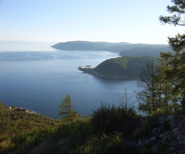 Пос. Листвянка, вид с Пика Черского. На левом берегу устья Ангары порт Байкал.