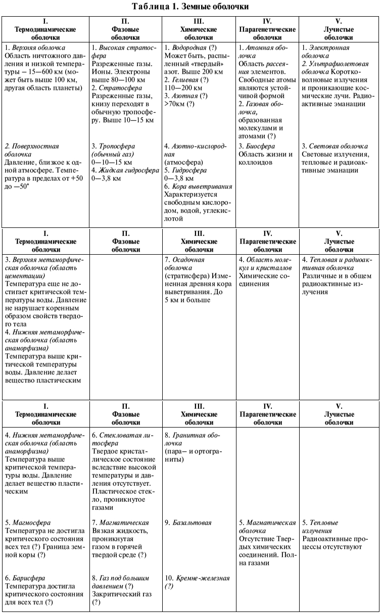 Таким образом, можно различить термодинамические оболочки, определяемые величинами температуры и давления, фазовые оболочки, характеризуемые физическим состоянием (твердым, жидким и т. д.) входящих в их состав тел, и, наконец, химические оболочки, отличающиеся своим химическим составом.