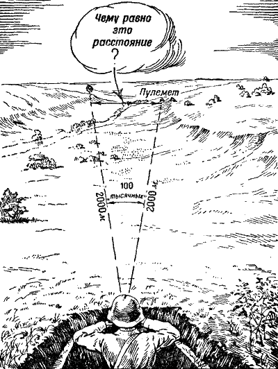 Задача эта решается очень просто. Надо только представить себе, что ваш наблюдательный пункт – это центр той окружности, которая описана радиусом, равным расстоянию от вас до пулемета (или до сосны). Радиус, таким образом, будет равен 2 000 метров. Углу в одну «тысячную» соответствует, как вы знаете, расстояние, равное одной тысячной радиуса, то-есть в данном случае 2 метрам. А так как угол между пулеметом и сосной равен не одной, а ста «тысячным», то, значит, расстояние между пулеметом и сосной равно не 2 метрам, а 200 метрам.