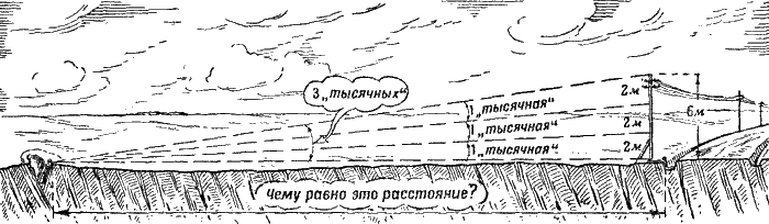 Измерьте теперь угол, которым покрывается высота телеграфного столба, и вы будете иметь все данные для решения этой задачи. Допустим, что угол этот оказался равным 3 «тысячным». Но если 6 метрам соответствует с этого расстояния угол в 3 «тысячных», то 1 «тысячной» будут соответствовать 2 метра. А всему радиусу, то-есть расстоянию от вас до шоссе, будет соответствовать величина, в 1 000 раз большая. Нетрудно сообразить, что расстояние от вас до шоссе будет равно 2 000 метров.