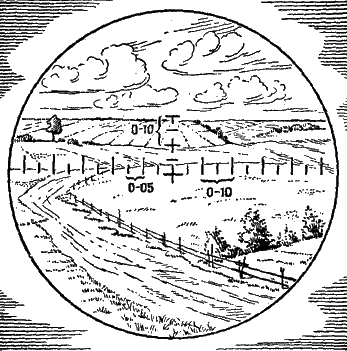 Рис. 177. Сетка бинокля: маленькое деление равно пяти «тысячным», большое – десяти «тысячным»