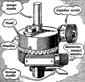На рисунке 178 показаны те части стереотрубы (лимб и барабан лимба), с помощью которых можно производить более точно, чем по сетке, измерение горизонтальных углов.
