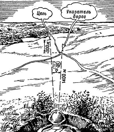 И все же, даже после хорошей тренировки, большие расстояния определять глазомером можно лишь весьма приблизительно, весьма грубо. Поэтому-то и не измеряют сразу дальность от себя до цели, а пользуются известным уже расстоянием до ориентира и на-глаз прикидывают лишь небольшое расстояние между ориентиром и целью. В этом случае ошибка не может быть велика.
