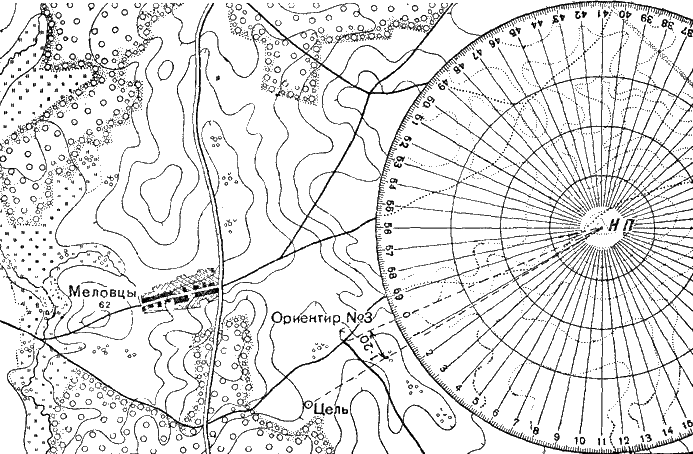 Расстояние же от наблюдательного пункта до цели вы отложите с помощью циркуля или обыкновенной миллиметровой линейки. Понятно, что способ этот даст достаточную точность только при условии, если дальность до цели определена точно и ориентир, относительно которого вы определяете положение цели, точно обозначен на карте.
