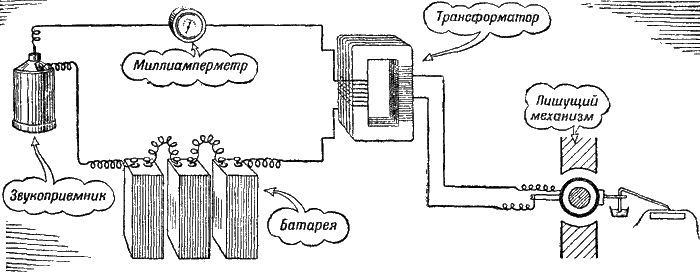 Звукоприемник (рис. 189) – это жестяной бак с узким горлышком, в которое вставлен тепловой микрофон, состоящий из тонких раскаленных электрическим током проволочек
