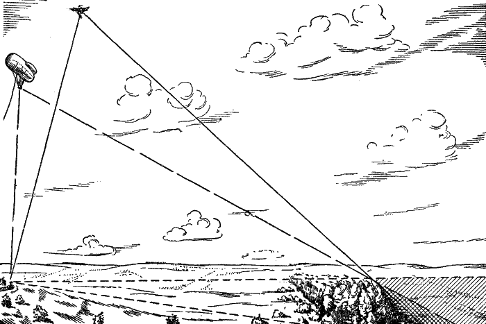 Рисунок 195 дает наглядное представление о сравнительных возможностях наземного наблюдения, наблюдения с аэростата и с самолета. Что недоступно одному, – доступно другому, что недоступно другому, – доступно третьему.