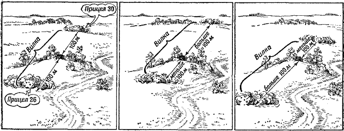 Рис. 243. Вилка 26-30 означает, что один из разрывов примерно не дальше 100 метров от цели