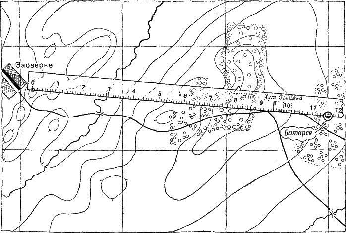 «Наводчику вести орудие вдоль дороги лесом. Остановиться скрытно вблизи опушки, не выходя из рощи». А сами отправляетесь выбирать позицию. Время не позволяет долго заниматься этим делом. Вот бугорок на опушке – место удобное: местность впереди видна хорошо – * значит, обстрел будет хороший; видна деревня Заозерье, видна и батальонная пушка противника в кустах влево от деревни; до нее километра полтора – значит, отсюда можно выполнить поставленную задачу.