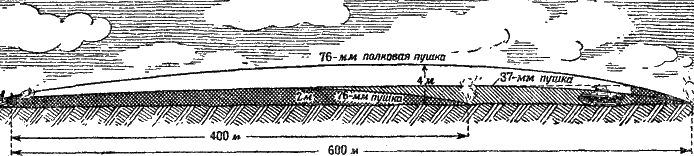 У противотанковой пушки дальность «прямого выстрела», то-есть такого выстрела, при котором траектория снаряда не поднимается выше танка, равна 600 метрам. А у полковой пушки дальность «прямого выстрела» по танку равна всего лишь 400 метрам: она и в этом уступает противотанковому орудию.