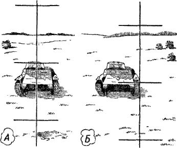 Теперь вертикальная нить совпадает уже не с серединой танка, а с правым его краем; горизонтальную же черту перекрестия наводчик совмещает с серединой танка, то-есть опускает ее ниже на полфигуры (рис. 283, Б).