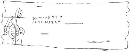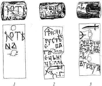 В качестве примера познакомимся с некоторыми надписями на таких «замках». Один из них, обнаруженный в слое конца Х в., содержит следующий текст: «Мецъницъ мѣхъ въ Тихъм[ен]гѣ пол[чет]ъвѣръ[та]» (Мешок мечника в Тихменге, три с половиной) (рис. 5, 3). Мечник, по «Русской правде», – сборщик государственных доходов в определенном регионе. Тихменга – река, впадающая в озеро Лаче на границе новгородских и белозерских владений, и примыкающий к ней район. «Три с половиной» (вероятно, гривны) – сумма содержимого мешка, причитающаяся мечнику[23]23