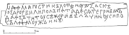 [Закрыть]. На той же усадьбе Людина конца, где найдены эти предметы, обнаружена берестяная грамота № 902 (рис. 6) с таким текстом: «От Домагости къ Хотеноу. В Езьске роздроубили полъ пятадесяте гривьнъ. Да язъ ти тоу сежоу, а Вълъчиноу си посъли моужь инъ» (От Домагостя к Хотену. В Езьске разверстали сорок пять гривен. Да я-то тут сижу, а в Волчино пошли другого человека)[26]26