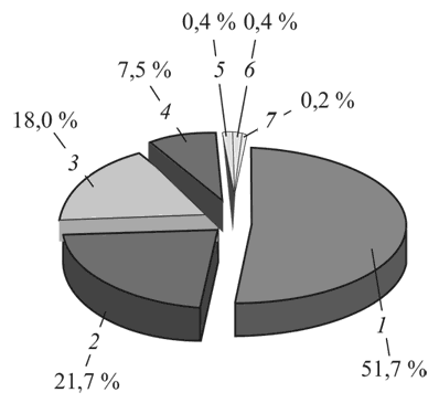1 – республиканский бюджет; 2 – целевые бюджетные фонды; 3 – местные бюджеты; 4 – ФСЗН; 5 – внебюджетные фонды; 6 – инновационные фонды; 7 – внебюджетные средства отдельных государственных органов