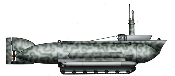 Сверхмалая подводная лодка-амфибия «Seeteufel» («Морской черт»). Это был 35-тонный аппарат длиной 14,2 метров с экипажем из двух человек. Первый прототип был подготовлен к испытаниям в июле 1944 г. Он имел интересную особенность – гусеницы, подобные тем, что имелись у бульдозера или танка, с их помощью аппарат мог выползать на берег для дозаправки, ремонта или передислокации в другой водоем. В качестве силовой установки использовался автомобильный бензиновый двигатель, позволявший двигаться под водой со скоростью 8 узлов, а по земле со скоростью 10 км/ч. Максимальная глубина погружения составляла 21 м. «Зеетойфель» должен был быть вооружен двумя торпедами или минами, а также пулеметами или огнеметами.
