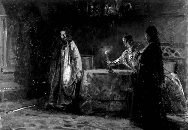 «Борис Годунов и царица Марфа, вызванная в Москву для допроса о царевиче Дмитрии при известии о появлении самозванца». Николай Ге