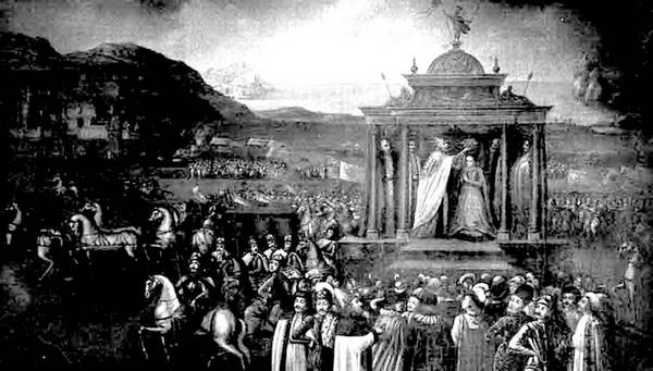 …Шло венчание на царство урожденного царя Дмитрия Ивановича. Царский дворец был разукрашен соответственно событию, путь от Успенского собора был устлан златотканым бархатом. Когда царь появился на пороге, бояре осыпали его дождем из золотых монет.
