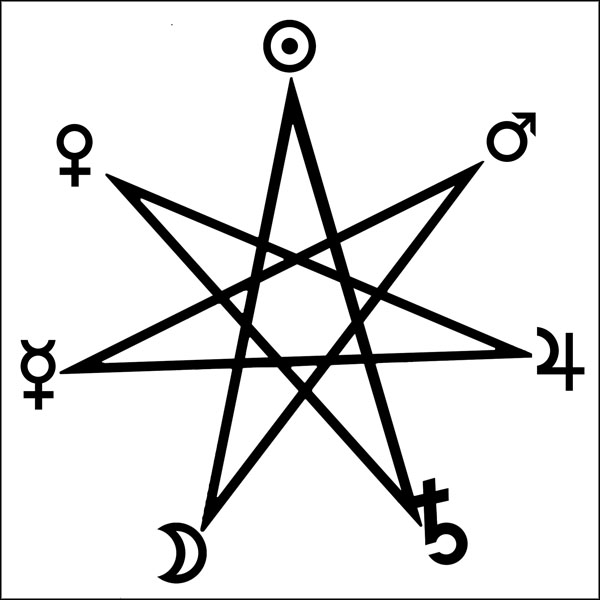 Однако Звезду Магов можно построить семью различными способами, помещая на ее верхнюю вершину разные планеты септенера, не меняя общую последовательность планет, круг планет поворачивается относительно семиконечной звезды.