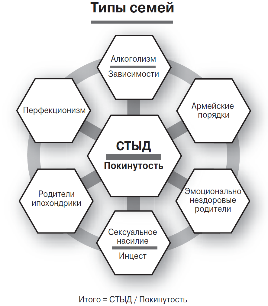 Мы включили в эту схему алкогольные семьи, чтобы показать: какой бы ни была дисфункция в семье, результат всегда один – стыд и покинутость. В этом мы все похожи.