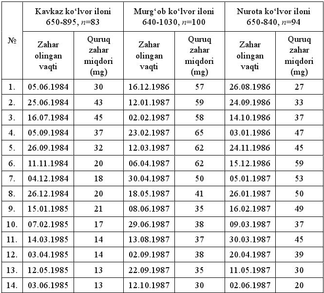 Ilondan olinadigan zaharning miqdori hayvonning o‘lchamiga, tashqi muhit haroratiga, so‘ngi marta qachon zahar olinganiga va zahar olish arafasida ilon ovqat yegan yemaganligiga bog‘liq. Odatda zahar olishdan 2-3 kun oldin ilonga ovqat berish to‘xtatiladi. Ilondan bir martada ko‘pi bilan 0,1 gr quruq zahar olish mumkin va ba’zi birlari shunchalik kam zahar beradiki, uning miqdorini aniqlash ham amrimahol. O‘rta Osiyo ilonlaridan kobra va ko‘lvor ilon eng ko‘p zahar beradi, charh ilon, bo‘sh ilon kamroq va cho‘l qora iloni juda kam zahar beradi. Shuni hisobga olish kerakki, ilon o‘z o‘ljasini chaqqanida yoki ilondan bir necha marta zahar olinganda ham zaharning ma’lum qismi zahira shaklida saqlanadi va 3–4 marta chaqqandan keyingina uning miqdori amalda kamayib ketadi. Shunisi qiziqki, tabiatda ilon o‘z o‘ljasini yoki dushmanini birinchi marta chaqqanida yuboradigan zaharning miqdori o‘sha dushmanning katta-kichikligiga bog‘liq. Ilon sichqon yoki qurbaqaga qaraganda ancha yirik hayvon (mushuk, quyon)larni chaqqanda ko‘proq zahar yuboradi. Shuni ham aytish kerakki, ba’zan soxta chaqishlar ham kuzatiladi, bunda ilon dushmaniga zahar yubormaydi, ya’ni ilon noqulay holatda tashlangani tufayli uning zaharli tishi g‘animini taniga kirmasdan jun yoki tuklar orasidan o‘tib ketadi. Ana shunday soxta chaqishlarni davolashda tabiblar va darveshlar o‘zlarining mahoratlarini namoyish etishda foydalanadilar. 8-jadvalda ilonlardan olingan zahar miqdori keltirilgan.