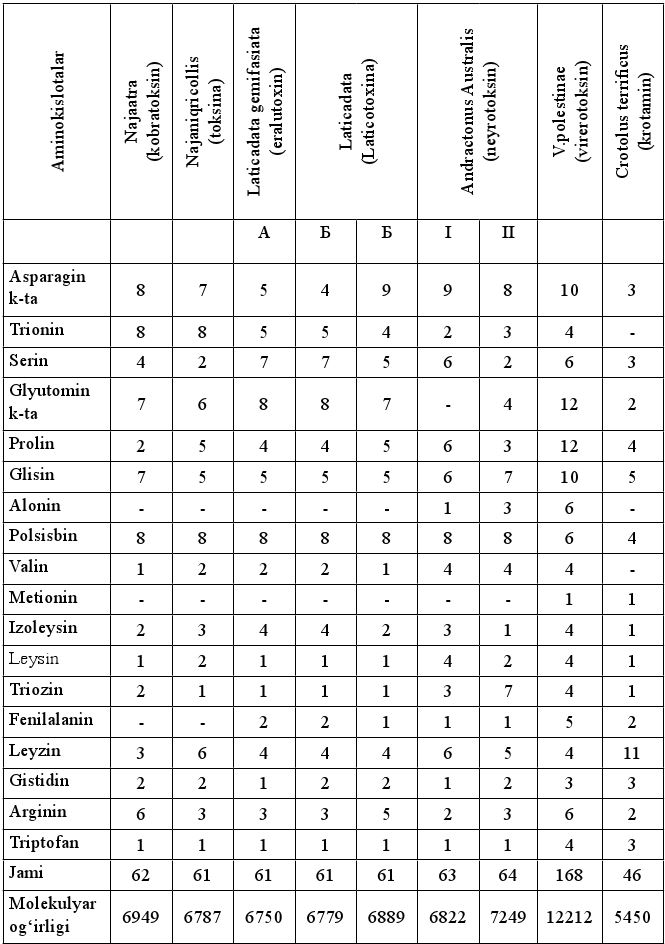 O‘rta Osiyo ilonlari zaharida hozir fanga ma’lum bo‘lgan barcha aminokislotalar uchraydi, har xil ilon turida ularning miqdori bir biriga yaqin bo‘lib, kuzatiladigan tafovutlar asosan gazandalarning yashash sharoiti bilan, ya’ni o‘sha yerdagi yemish turlari – flora va faunasiga bog‘liq.