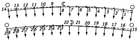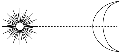 Иначе говоря, центр Солнца должен находиться на перпендикуляре, проведенном через середину прямой, соединяющей концы месяца. Однако правило это соблюдается только для узкого серпа, расположенного неподалеку от Солнца. На рис. 35 показано положение месяца в разных фазах относительно лучей Солнца. Впечатление получается такое, словно лучи Солнца искривляются, прежде чем достичь Луны.