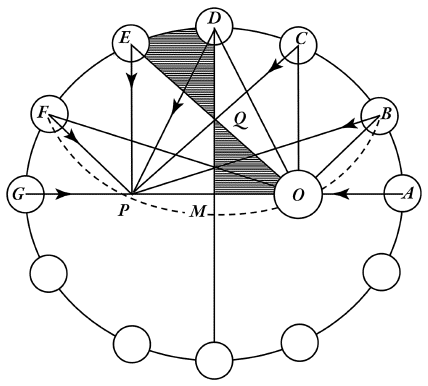 Интересно проследить за тем, как нарастает и убывает угол либрации с передвижением Луны по орбите. Поставим в D острие циркуля и опишем дугу, проходящую через фокусы О и Р. Она пересечет орбиту в точках B и F. Углы ОВР и OFP как вписанные равные половине центрального угла ODP. Отсюда выводим, что при движении Луны от А до D либрация растет сначала быстро, в точке В достигает половины максимальной, затем продолжает нарастать медленно; на пути от D до F либрация убывает сначала медленно, потом быстро. На второй половине эллипса либрация меняет свою величину тем же темпом, но в обратную сторону. (Величина либрации в каждой точке орбиты приблизительно пропорциональна расстоянию Луны от большой оси эллипса.)