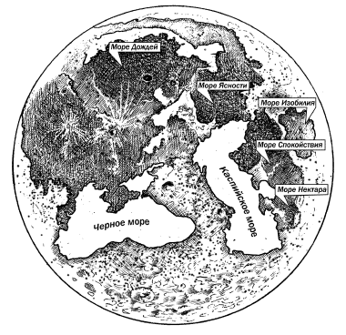Чтобы сделать наглядными размеры лунных «морей» по сравнению с земными, на рис. 40 на карту Луны наложены в том же масштабе контуры Черного и Каспийского морей. Сразу видно, что лунные «моря» не особенно велики, хотя и занимают заметную часть диска. Море Ясности, например (170 000 км2), приблизительно в 2½ раза меньше Каспийского.