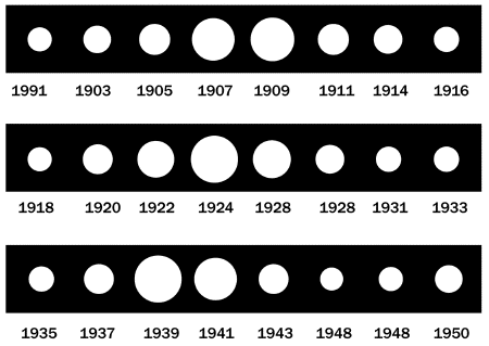 Рис. 64. Изменение видимого диаметра Марса в различные противостояния XX в. В 1909, 1924 и 1939 гг. были великие противостояния.