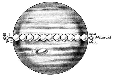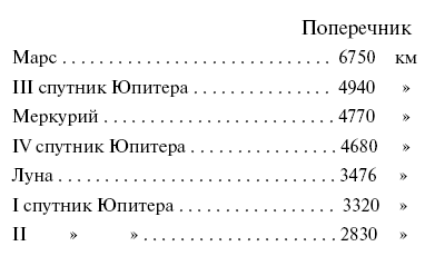 Такой вопрос можно поставить относительно Юпитера – самой крупной из планет нашей системы. Этот исполин, из которого можно было бы сделать 1314 шаров такого объема, как земной, своим могучим притяжением заставляет обращаться вокруг себя целый рой спутников. Астрономами обнаружено у Юпитера 16 больших и более 20 малых лун; самые крупные из них – те 4, которые еще три века назад были открыты Галилеем, – обозначаются римскими цифрами I, II, III, IV. Спутники III и IV по размерам не уступают «настоящей» планете – Меркурию. В следующей табличке поперечники этих спутников сопоставлены с размерами диаметров Меркурия и Марса; заодно указаны поперечники первых двух спутников Юпитера, а также и нашей Луны: