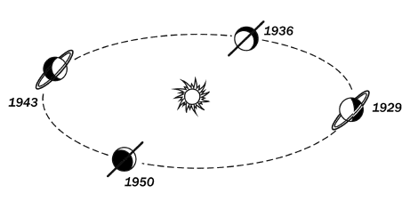 Рис. 66. Какие положения занимают кольца Сатурна по отношению к Солнцу в течение 29-летнего обращения планеты по орбите.