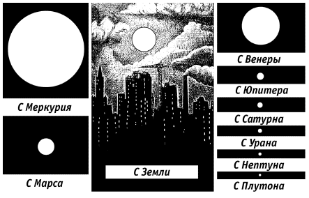 Рис. 67. Видимые размеры Солнца с Земли и других планет (рисунок нужно держать на расстоянии около 50 см)