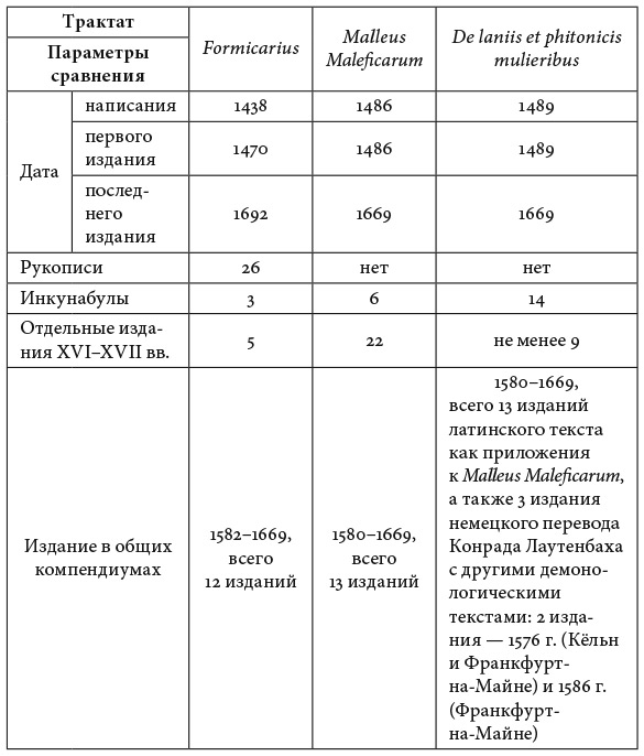 Три демонологических трактата XV века: Formicarius («Муравейник») Иоганна Нидера, Malleus Maleficarum и De laniis et phitonicis mulieribus Ульриха Молитора – сформировали своего рода «ядро» демонологии как литературного жанра. Их продолжали издавать с завидным постоянством на протяжении двух столетий, причем начиная с 1580 года – объединяя в компендиумы. Интересно, что в конце XV века «Молот ведьм» существенно уступал по количеству изданий сочинению Молитора и только позднее, в XVI–XVII вв., вышел в лидеры, вобрав в себя текст сочинения-конкурента. В таблице 1 ниже я привожу основные сведения об изданиях трех ключевых трактатов о злонамеренном колдовстве.