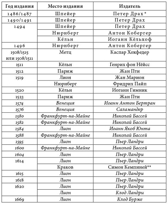 Разреженным шрифтом выделены издания, увидевшие свет при жизни Генриха Инститориса, курсивом – издания отредактированного текста, приведенного к нормам классической латыни.