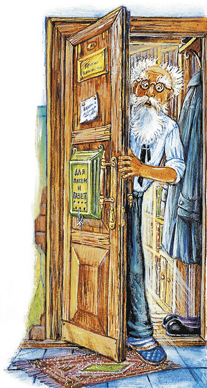 Карик постучал, но никто не отозвался. Тогда он потянул на себя ручку двери, и она вдруг открылась. Ребята вошли в полутемную переднюю. Здесь было прохладно. В углу поблескивало большое зеркало. Сверху с большого шкафа смотрели на ребят бронзовые и мраморные головы. На вешалке висели шуба профессора, пальто и темный плащ, похожий на шахматную доску.