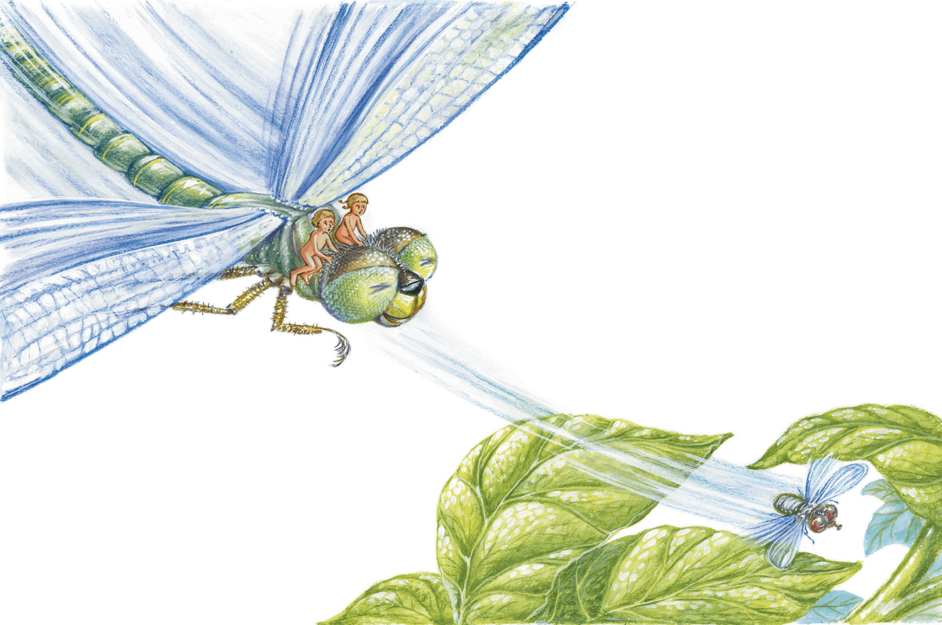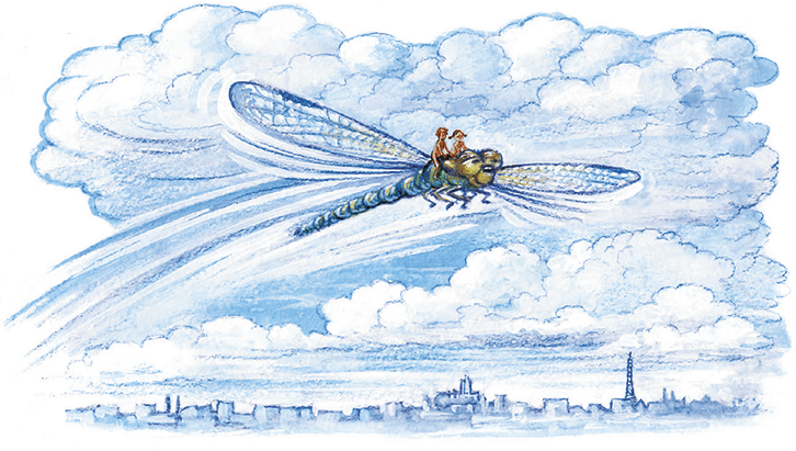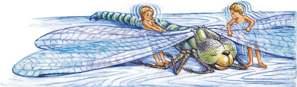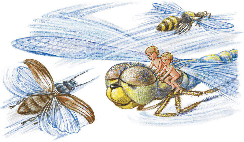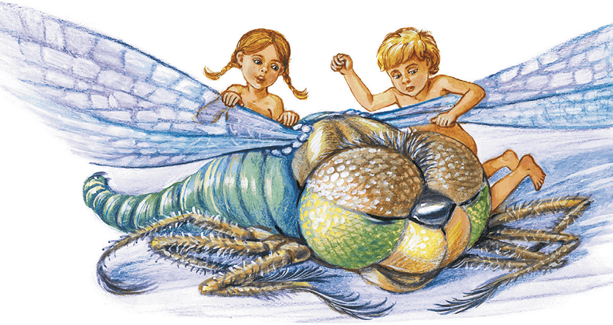 Помогая друг другу, ребята проворно вскарабкались на стрекозу, но лишь только они уселись, как стрекоза зашевелилась, застучала громыхающими крыльями, тяжело заворочалась и запыхтела, как машина. Ребята почувствовали, как под ними начало выгибаться сильное мускулистое тело.