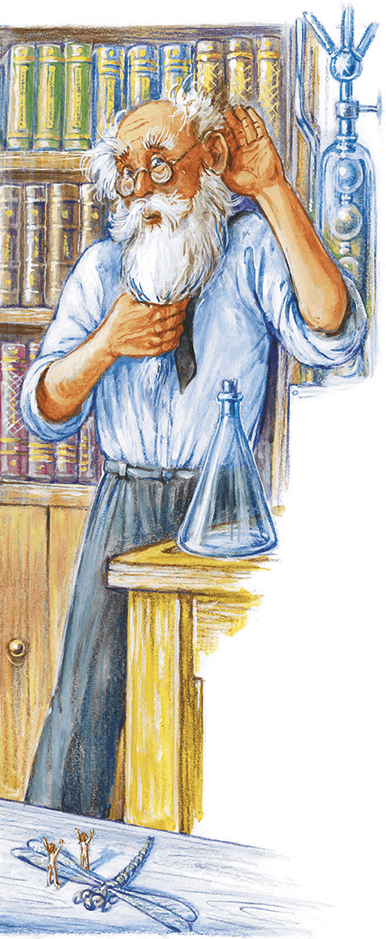 – А мы… А мы… А мы… Слушай, Карик, я уже придумала… Знаешь что, мы сядем на стрекозу. Иван Гермогенович увидит дохлую стрекозу и обязательно положит ее к себе на стол, а мы тогда заберемся под микроскоп, и он увидит нас… Ну конечно, увидит! И сделает опять большими… Залезай скорее на стрекозу.