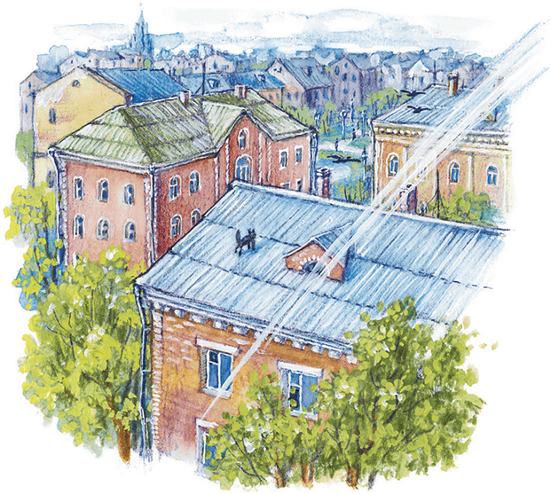 Карик хотел спрыгнуть с подоконника на диван, стоявший у окна, но диван вдруг быстро помчался вниз, точно лифт с верхнего этажа. Ничего не понимая, он растерянно посмотрел по сторонам и тут увидел, что вся комната как-то странно растягивается и вверх и вниз.