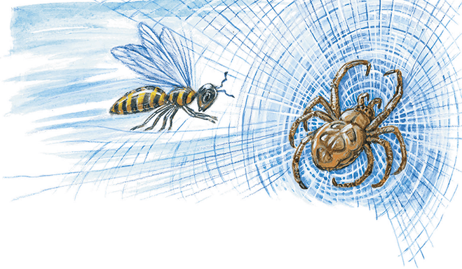 Паук, опираясь на гребни ног, заскользил по своей паутине, прочесывая ее ногами. Он обежал вокруг осы раз, другой, потом стал подкрадываться к ней сзади.